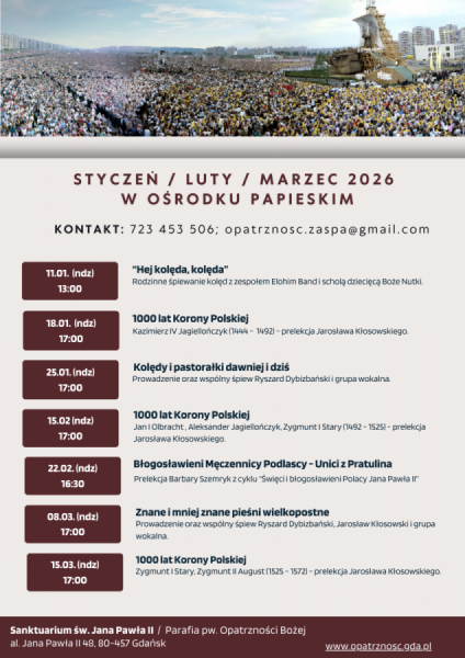 Kalendarium wydarzeń w Ośrodku Papieskim na pierwszy kwartał tego roku jest dostępne na plakacie poniżej. Grafika powiększa się po kliknięciu na nią.