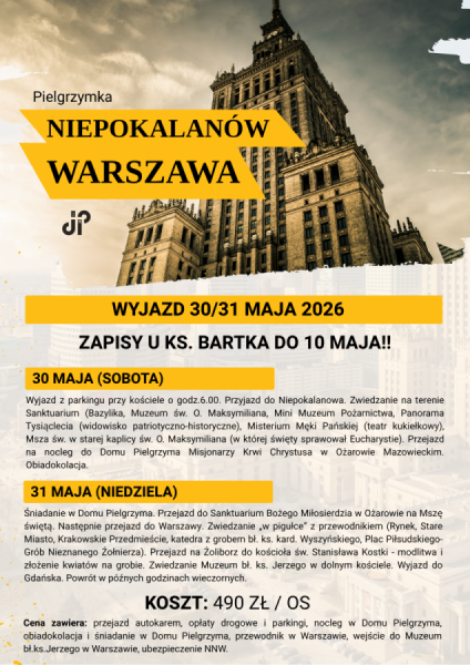 Nasza parafia organizuje dwudniową pielgrzymkę do Niepokalanowa - do Sanktuarium św. Ojca Maksymiliana i do Warszawy - na grób bł. ks. Jerzego Popiełuszki w dniach: 30 i 31 maja. Szczegółowe informacje na plakacie [możliwość powiększenia po kliknięciu na grafikę]. Zapisy u ks. Bartka do 10 maja. Zapraszamy.